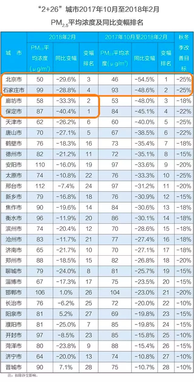 从改善幅度看,“2+26”城市2017年10月至2018年2月PM2.5平均浓度均同比下降,降幅均满足改善目标进度要求。降幅排名前3位的城市为北京、石家庄和廊坊,同比分别下降54.5%、48.6%和48.0%。