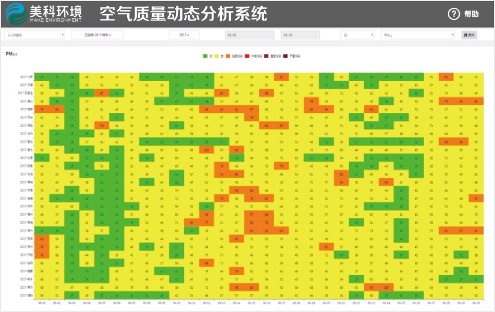 通过对全国范围空气质量监测数据的集成分析和挖掘,时时掌握大气污染物的时空变化规律,动态分析城市污染成因、排名变化与对标差距,实现分析结果的直观可视化。