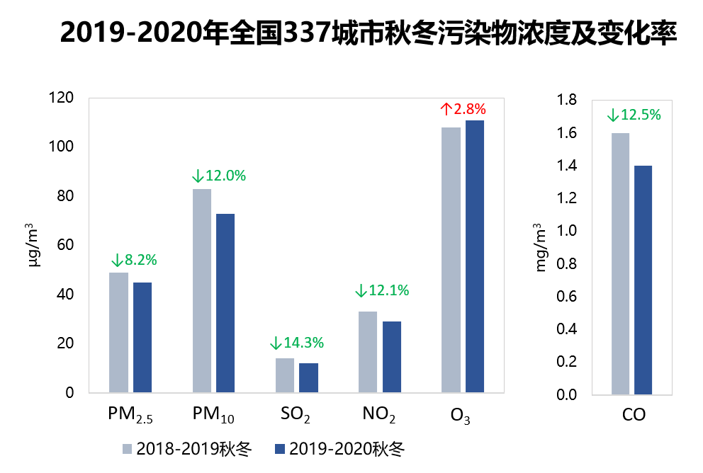 如下图所示,2019-2020秋冬季期间,337个地级及以上城市空气质量整体有所改善,但是O3浓度却上升了2.8%。