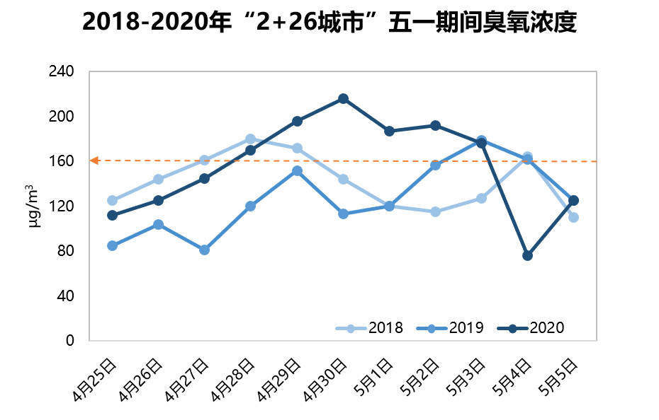 随着气温逐渐升高,我国部分地区逐渐出现复合型污染天气。今年五一期间,京津冀及周边地区(“2+26”城市)出现了O3和PM2.5复合污染,全国多个城市也出现O3污染现象。如下图所示,4月28日开始,“2+26”城市全部出现O3超标现象,北京、唐山、廊坊的O3浓度日最大8小时滑动平均值更是达重度污染水平。