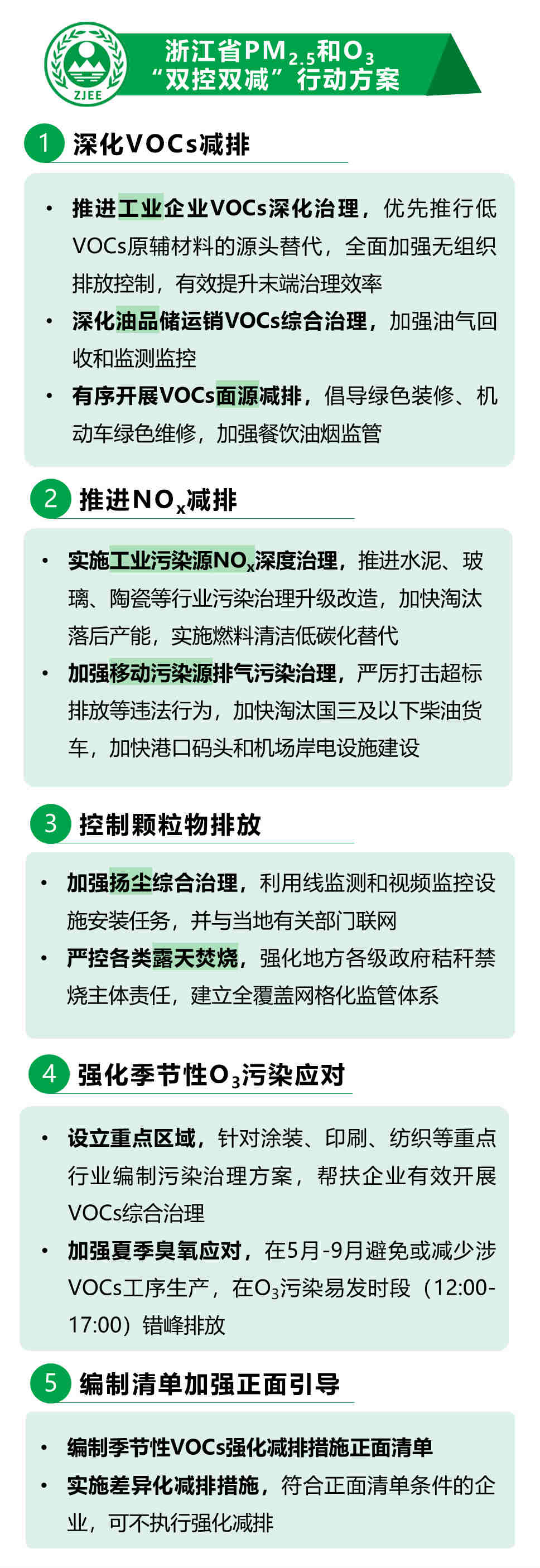 浙江省大气办印发了《浙江省2020年细颗粒物和O3“双控双减”实施方案》,并首次制定《季节性VOCs强化减排措施正面清单(第一版)》。《实施方案》以环杭州湾和金衢盆地为重点区域,以夏秋季(5-9月)为重点时段,分区、分类、分时精准采取强化减排措施。具体措施分为以下几个方面: