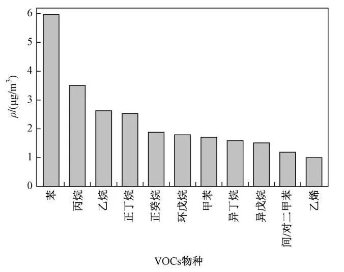 2017年,北京市城区春季总挥发性有机物(TVOCs)的质量浓度为34.36μg/m³,其中烷烃、芳香烃、烯烃、炔烃的质量浓度分别为19.63μg/m³(占57.13%)、11.40μg/m³(占33.18%)、2.59μg/m³(占7.54%)和0.74μg/m³(占2.15%)。质量浓度最高的前3位挥发性有机物物种分别为苯、丙烷和乙烷,分别为5.97μg/m³、3.51μg/m³和2.63μg/m³(如图1所示)。