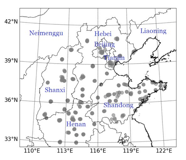 图1:模型模拟区域京津冀及周边地区(圆点代表国家空气质量监测站点点位)