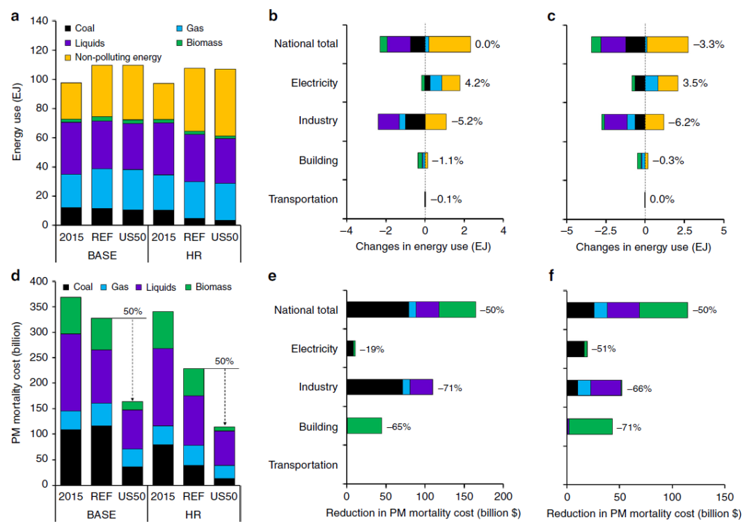 研究发现,因PM2.5排放的PMMC因子较高,PM2.5减排对实现US50健康目标的贡献最大。对比基础情景(BASE REF),削减50%PMMC(US50)需实现减排51%的PM2.5、32%的SO2、11%的NO2排放量。在美国实现该减排目标,成本效益最好的减排策略为大力推进“电能替代”,例如使用“电能”替代工业用煤,工业液体,以及居民生物质使用。