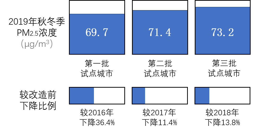 总体来看,北方地区冬季清洁取暖工作成效显著,43个试点城市秋冬季空气质量明显改善。如图2所示,三批试点城市2019年秋冬季PM2.5平均浓度相比改造前分别下降36.4%、11.4%和13.8%。