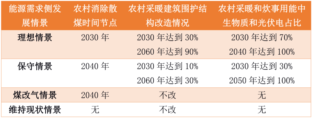 为探索我国农村建筑低碳发展路径,清华大学建筑节能研究中心设计了四种农村能源需求侧发展情景,即理想、保守、煤改气和维持现状情景(表1)。每种情景设定考虑了消除散煤、改造建筑结构、加大生物质与光伏能源占比三种措施及其阶段性目标。