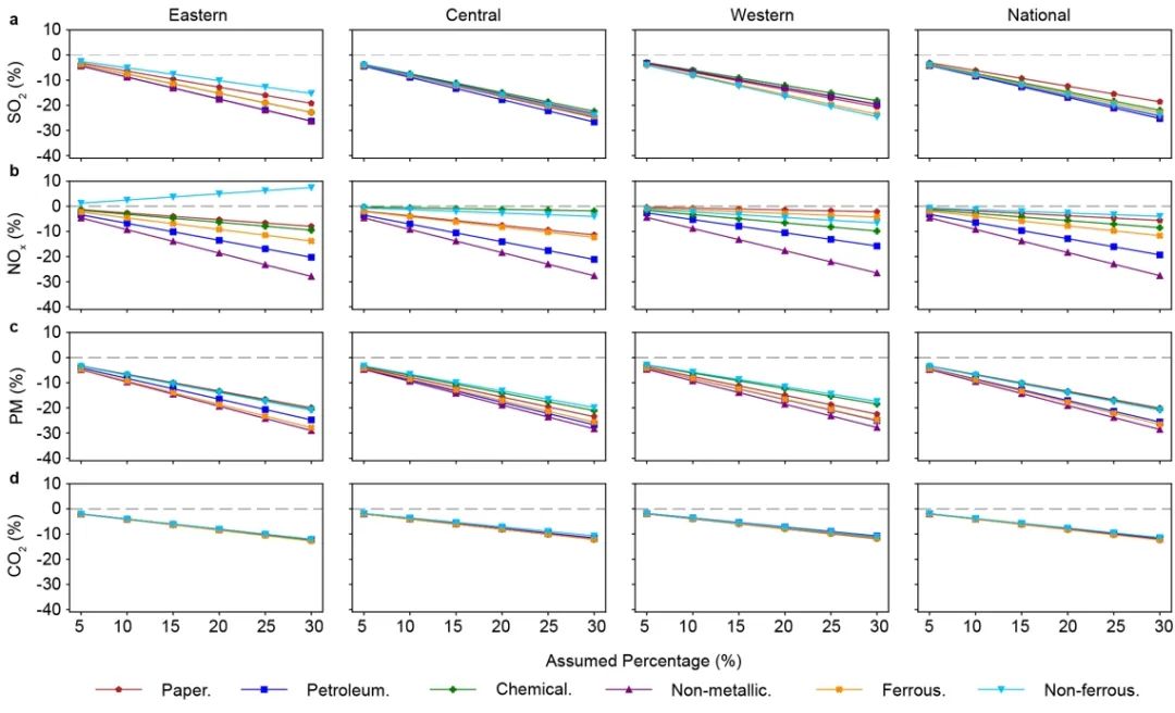 图2. 当非化石能源发电占比为70%,不同电气化情景的空气污染物和CO2减排比例(Qian et al., 2021)