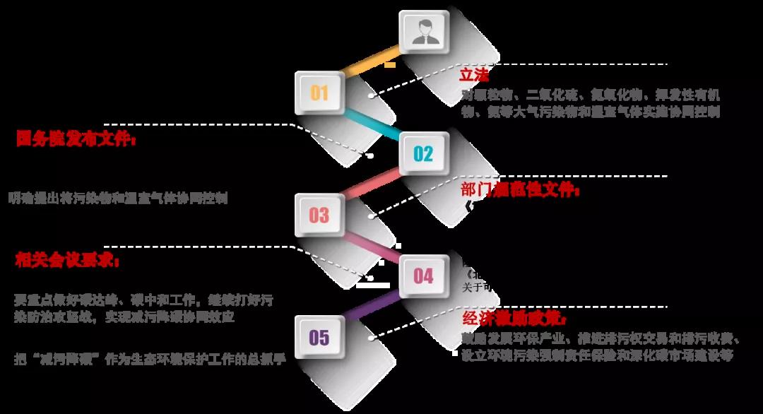 《中华人民共和国大气污染防治法》规定:对颗粒物、二氧化硫、氮氧化物、挥发性有机物、氨等大气污染物和温室气体实施协同控制;《“十三五”控制温室气体排放工作方案》《打赢蓝天保卫战三年行动计划》明确提出,将污染物和温室气体协同控制;生态环境部、发展改革委等部门也先后发布一系列部门规范性文件,对大气污染物与温室气体协同控制提出了目标或任务要求;近期召开的相关工作会议上也提出实现减污降碳协同效应的要求,如“重点做好碳达峰、碳中和工作,继续打好污染防治攻坚战,实现减污降碳协同效应”“把‘减污降碳’作为生态环境保护工作的总抓手”等(图1)。与此同时,我国还制定了多样化的经济激励政策促进污染物治理和温室气体减排,如鼓励发展环保产业、推进排污权交易和排污收费、设立环境污染强制责任保险和深化碳市场建设等。