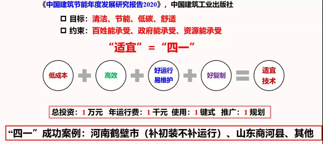清洁取暖发展模式和技术路径应当立足于当地资源禀赋、经济水平、基础设施等条件,从前期初投资、农户使用要求、取暖运行费和区域整体实施等多个维度综合考虑。所谓“四一”模式,就是每户建筑节能和取暖设备改造总初投资平均不超过