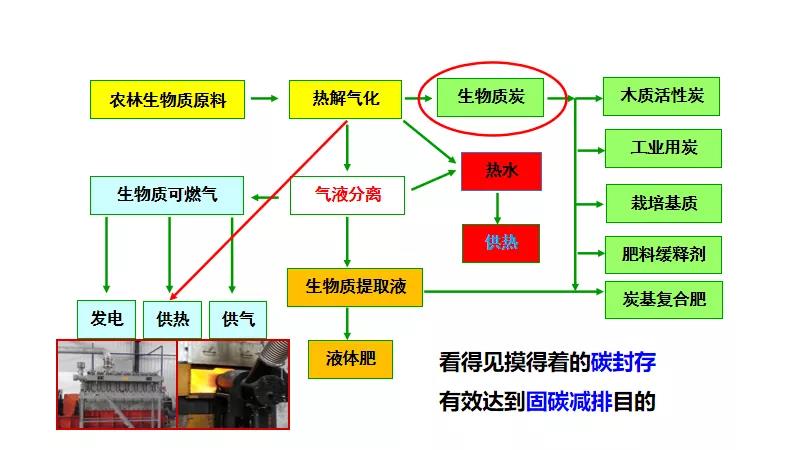 9个原子)分解成小分子生物质可燃气、生物质炭和生物质提取液。生物质可燃气用于发电、供热、供气;生物质提取液可做肥料;生物质炭可做多种用途(图1)。与其他同类技术相比,该技术实现了农林生物质气化联产炭、热、肥,并可产业化生产,同时获得环境和经济效益,极具市场竞争力。
