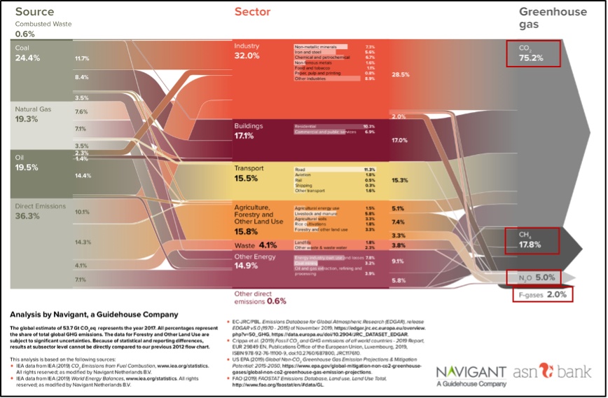 因为二氧化碳排放量很大,尽管其余温室气体的全球增温潜势远大于二氧化碳,但由于它们在空气中含量少,综合影响是小于二氧化碳的。例如,2017年全球温室气体排放537亿吨,其中75.2%为二氧化碳(co₂)。